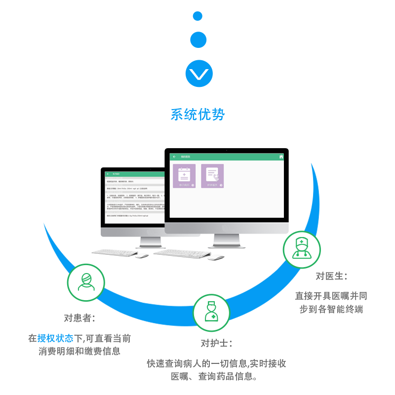 对患者住院期间的各类体征 数据自动上传至终端生成曲 线图、三测单;报表可查 询、导出及打印,这样既减 轻了护理人员的工作压力又 解决了因人工记录容易出现 误差的问题。还可查询当前 患者所有治疗、护理信息以 及该病人在该医院的完整病 往史;可共享所需患者给不 同科室医生,实现医院智能 联动会诊。