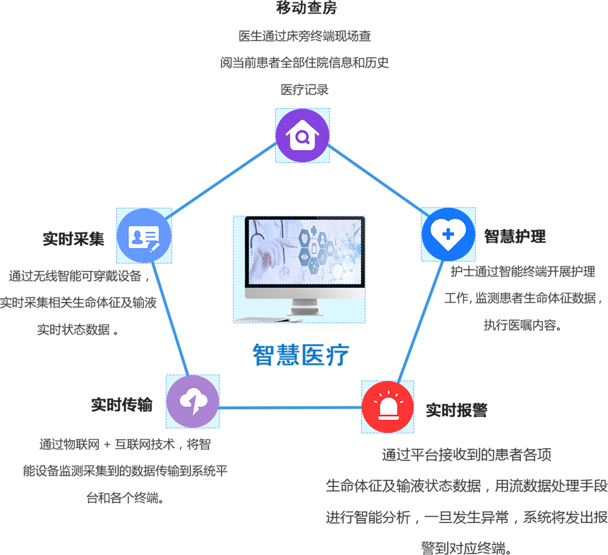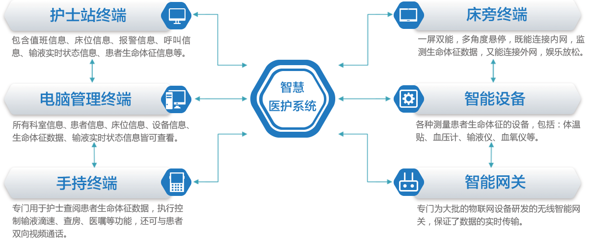 实时采集患者生命体征数据, 远程输液控制,智能化的医 疗护理方式大大降低了医护 人员的工作劳动强度,也为 患者带来了便捷舒适的就医 体验。